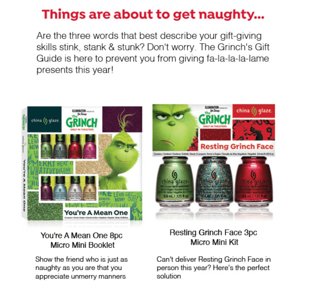 Inbox, meet impact. Whether heroing a new product or rolling out collaborations like the Grinch x China Glaze Holiday Collection, I adapt my voice to fit each brand’s unique personality. From subject line to CTA, every word is crafted to spark excitement, engage readers, and drive action.