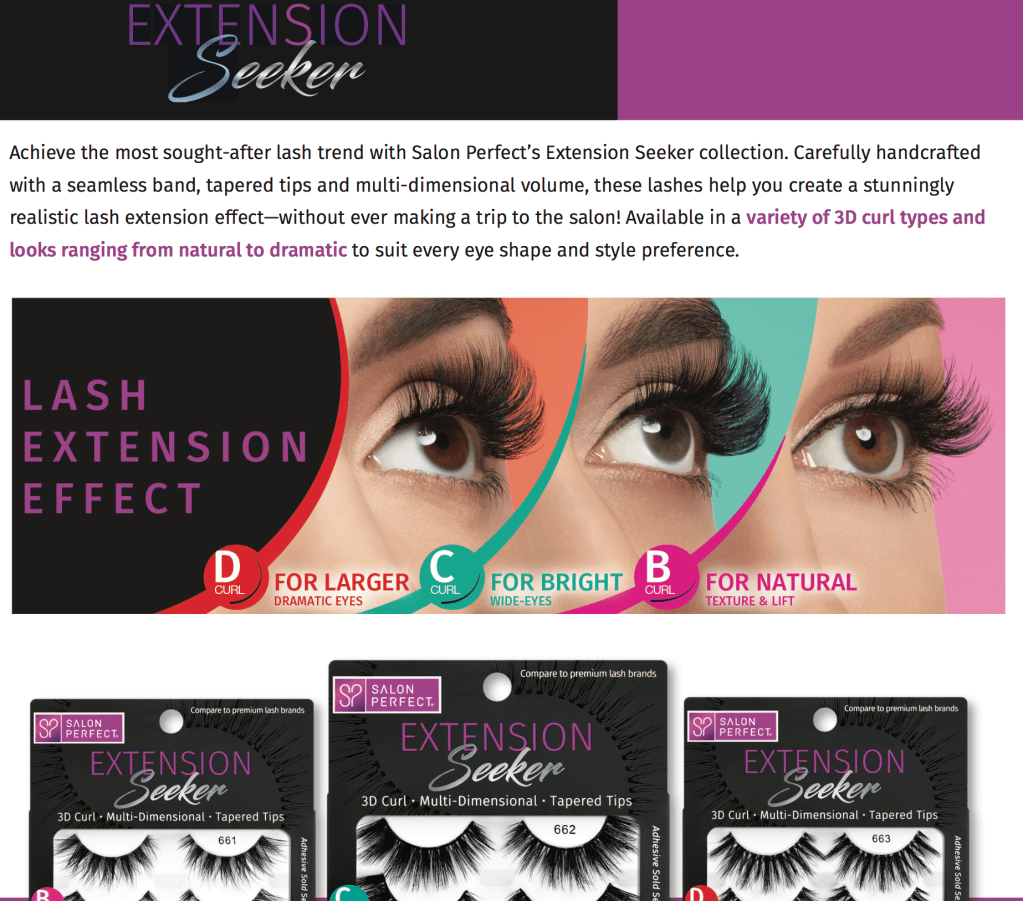I conceived the “Extension Seeker” name for Salon Perfect’s line of false lashes, which are designed to create a lash extension-like effect, as well as packaging and launch copy.